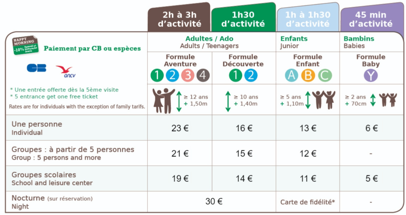 Pour les formules « Enfant », des départs sont proposés toutes les 10 minutes entre 10h00 et 11h30 le matin et entre 13h00 et 17h00 l’après midi (10 enfants maximum par départ).
